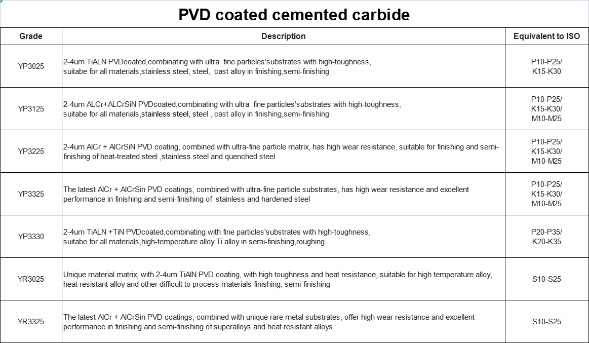 | YP3025 | 2-4um TiALN PVD涂層,與超細(xì)顆?;w結(jié)合,具有高韌性,適合所有材料,不銹鋼、鋼、鑄造合金精加工、半精加工 | P10-P25 K15-K30 |