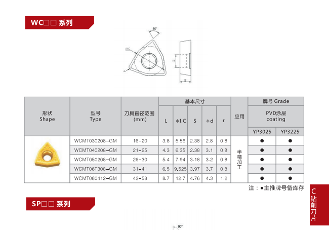 | YP3225 | 2-4um AlCr + AlCrSiN PVD涂層,結(jié)合超細顆?;w,具有高耐磨性,適用于熱處理鋼、不銹鋼和淬火鋼的精加工和半精加工 | P10-P25 K15-K30 M10-M25 |